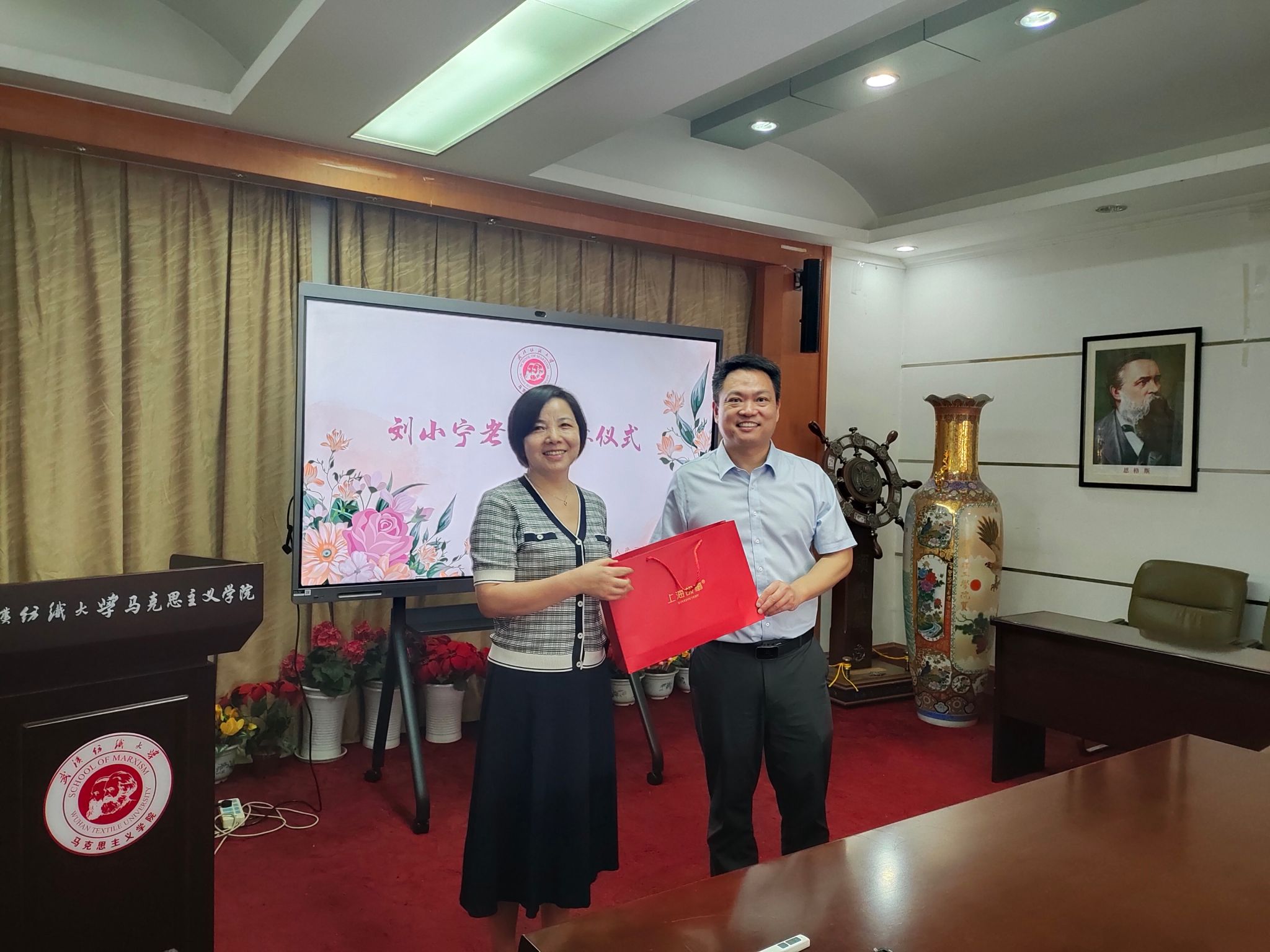 随后,学院举办荣休仪式,全体教师共同见证刘小宁老师光荣退休的时刻。刘小宁老师作为成人文学 的资深教师,多年来为学院的教学和科研工作做出了杰出的贡献。在荣休仪式上,院长肖述剑代表学院向刘小宁老师表达了崇高的敬意和衷心的感谢,并祝愿她退休生活幸福安康。青年教师代表蒋辛为刘小宁老师献上鲜花。思想道德与法治教学部主任常沛老师、思想政治理论实践课教学部主任方芳老师分别代表课部发言,回忆了与刘小宁老师在课部一起工作的点点滴滴,为刘小宁老师送上诚挚的祝福和感谢。刘小宁老师对学院的关怀、同事的关心表示由衷的感谢,在畅想美好退休生活的同时也对30余年教学生涯表达了深深的不舍,表示将一如既往地关注和支持学院的发展。