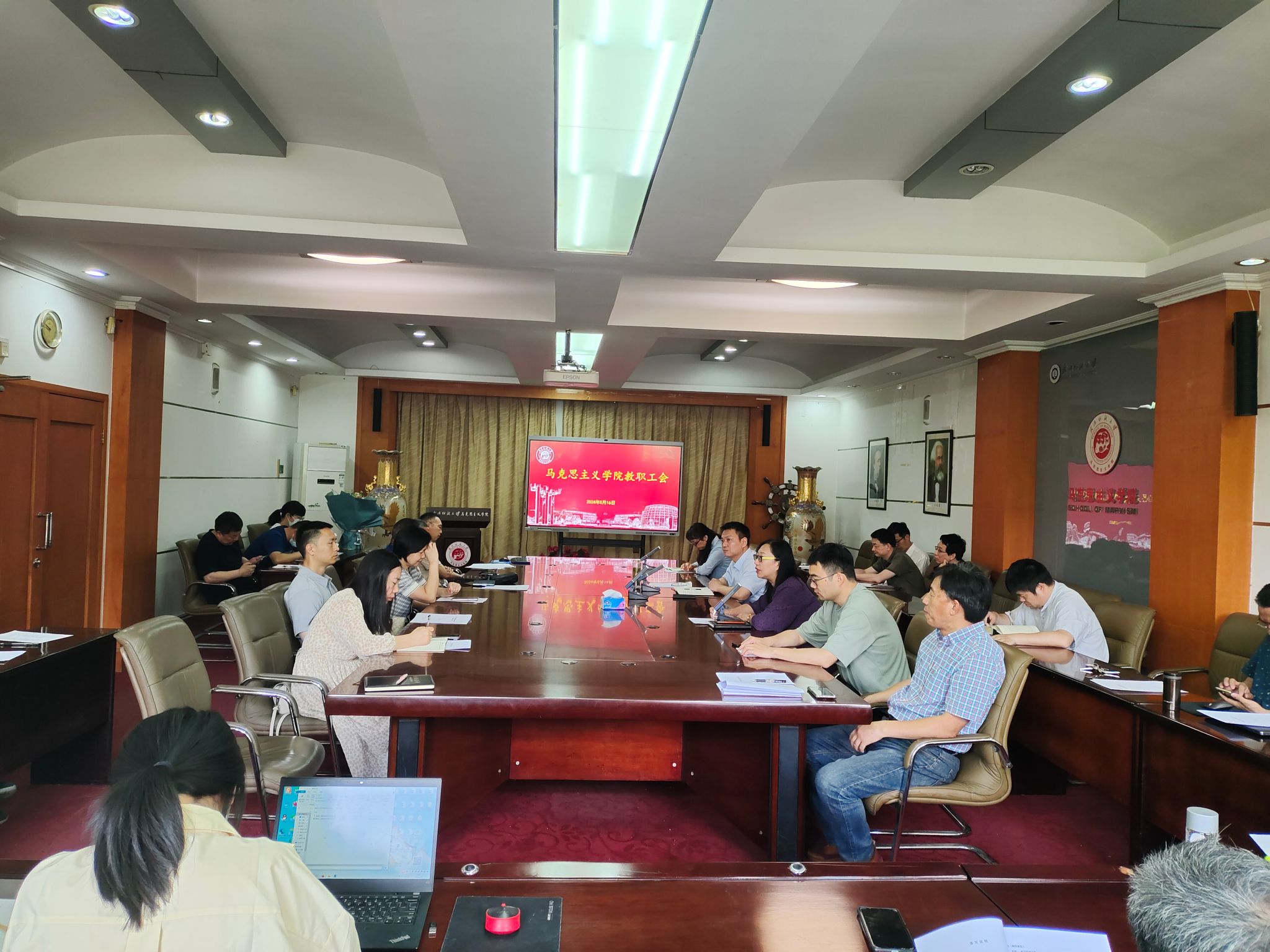 接下来,学院班子对近期学院的教学和科研工作进行了总结和部署。院长肖述剑就第四轮事业单位聘用合同签订、研究生督导中期检查、研究生培养、学科建设、纪律规范做了通报和要求。副院长刘艳传达了新时代本科教育教学高质量发展大会精神,并就期中教学检查,思政课教师集体备课和暑期社会实践工作做了部署。