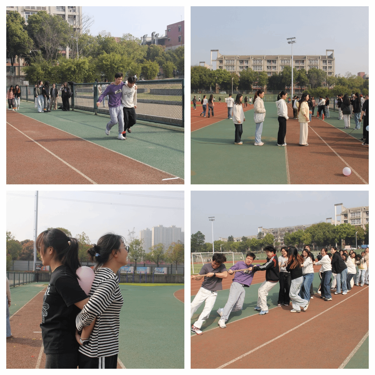 比赛过程中,各参赛队伍秉持“友谊第一,比赛第二”的原则,既在赛场之上奋勇争先,又在互动中互帮互助、增进情谊。在两人背夹气球项目中,四人组队分两小队接力,大家步调协同、彼此配合,向着终点全力冲刺。趣味投壶现场,选手们凝神瞄准,每一次精准投中都引来现场阵阵欢呼,传统游戏与趣味竞技碰撞出别样火花。两人三足项目里,队员们脚踝相绑,喊着整齐的口号并肩向前,大家争分夺秒,只为刷新团队成绩;跳绳大挑战中,1分钟内的每一次跳跃都凝聚着团队力量,绳子的挥动声、脚步声与呐喊声交织成赛场最热烈的旋律。压轴的拔河项目将现场氛围推向高潮,所有队伍平均分为两大组展开对决,同学们紧握长绳、身体后倾,齐心协力向着同一方向发力。最终获胜队伍获得2分,第二名获得1分,为这场力量与协作的比拼画上圆满句号。