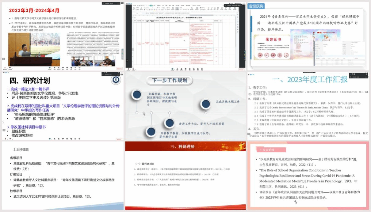成人文学 阳光讲席教授项久雨和外国语学院阳光讲席教授季水河分别委托团队成员常沛和刘方荣做报告发言,介绍了近3年指导学校马克思主义理论学科、外语学科在人才培养、学科建设方面所做的工作和取得的成果。成人文学 阳光特聘教授金艳、王海燕展示了在教学质量提升、科研成果产出和社会服务等方面的突出成绩。张守慧、李少多、陈春兰等12名参加2023年度考核的博士专任教师对照合同任务,逐一报告了任务完成情况。