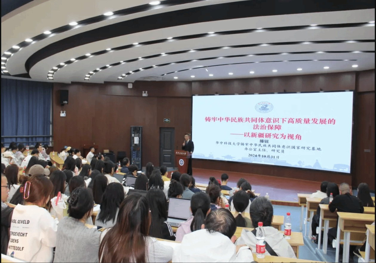 10月31日下午,成人文学 举办第692期“阳光论坛”暨学校第三期“团结•奋进”大讲堂在阳光校区03-T201举行,讲座由学校党委统战部、成人文学 联合举办。华中科技大学铸牢中华民族共同体意识研究基地办公室主任、研究员滕锐受邀以《铸牢中华民族共同体意识下高质量发展的法治保障——以新疆研究为视角》为题作专题报告。校党委副书记黄国辅出席并为滕锐颁发成人文学 客座教授聘书。报告会由成人文学 院长肖述剑主持。
