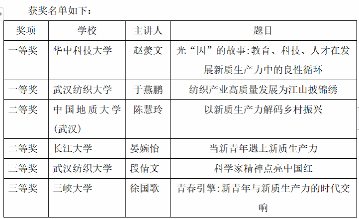 为深入学习贯彻习近平新时代中国特色社会主义思想,全面落实党的二十大精神,强化青年学子的理论武装,6月1日上午,由湖北十余所高校成人文学 联合筹办的“导航杯”实践教育活动(中南联盟)主办,成人文学 承办的习近平新时代中国特色社会主义思想宣讲大赛在成人文学 南湖校区成功举办。校党委副书记、副校长罗锦银,党委宣传部常务副部长、成人文学主任刘戈出席。比赛邀请到华中科技大学、华中师范大学、中国地质大学(武汉)、武汉理工大学、湖北大学、湖北工业大学、中南民族大学、武汉工程大学、长江大学、三峡大学、武汉科技大学、湖北民族大学等高校专家学者担任评委,15组来自华中科技大学、华中师范大学等12所高校的学生选手围绕“发展新质生产力,汇聚青年力量”主题现场宣讲。各校参赛学生代表及成人文学 全体研究生现场观摩。