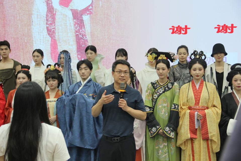 为增强现场体验感,服装学院研究生身着按史料复原的周制深衣、唐制齐胸襦裙、明制马面裙等经典形制服饰,进行立体动态展示。随后,服装表演专业的学生带来一场“传统与现代的对话”主题走秀,借由面料混搭、结构重构,直观演绎传统服饰文化与现代设计理念的碰撞交融。陶辉结合每件服饰的纹样寓意、剪裁工艺,深入阐释了“自信—自省—自新”的文化逻辑:挖掘传统服饰底蕴筑牢自信根基,以开放视野推动多元融合与变革作为自省方向,借创意设计让传统服饰文化在当代焕发生机,实现文化自信。