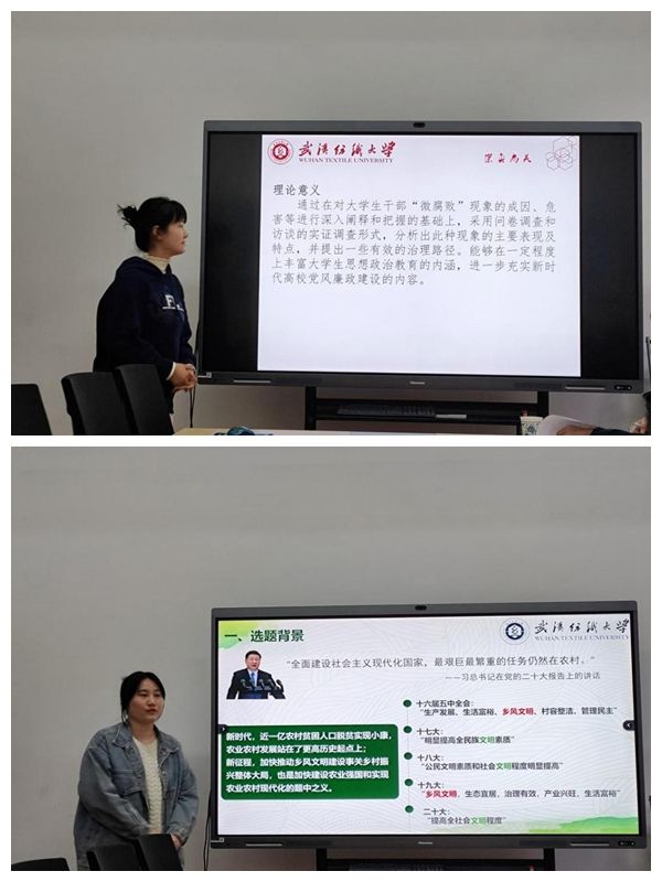 向依婷以“民族地区生态文明建设研究——以恩施州为例”为题,秦伯睿以“延安时期党的文艺政策对艺术创作影响研究——以木刻版画为例”为题,王野以“新时代大别山精神传播研究”为题,吕点点以“大学生干部‘微腐败’现象的成因、危害及治理路径研究—基于湖北省十所高校的实证调查”为题,郑依然以“‘两个结合’赋能乡风文明建设的内在逻辑与现实路径——基于湖北省N村的实证分析”为题,万傲杰以“党建引领新工科研究生思想政治教育困境与对策研究”为题,对各自的研究项目进行汇报。大家通过研究现状、研究目的、研究意义等方面展开阐述。评审老师根据大家汇报的项目选题意义、研究方法、研究基础和课题设计进行评分。