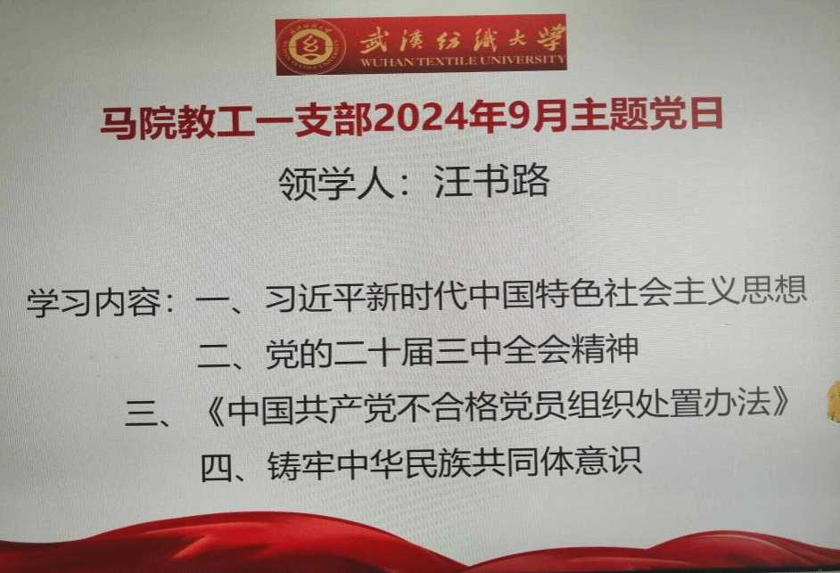9月26日下午,成人文学 教工第一党支部举行9月份主题党日活动会议,会议由支部书记王海燕同志主持。