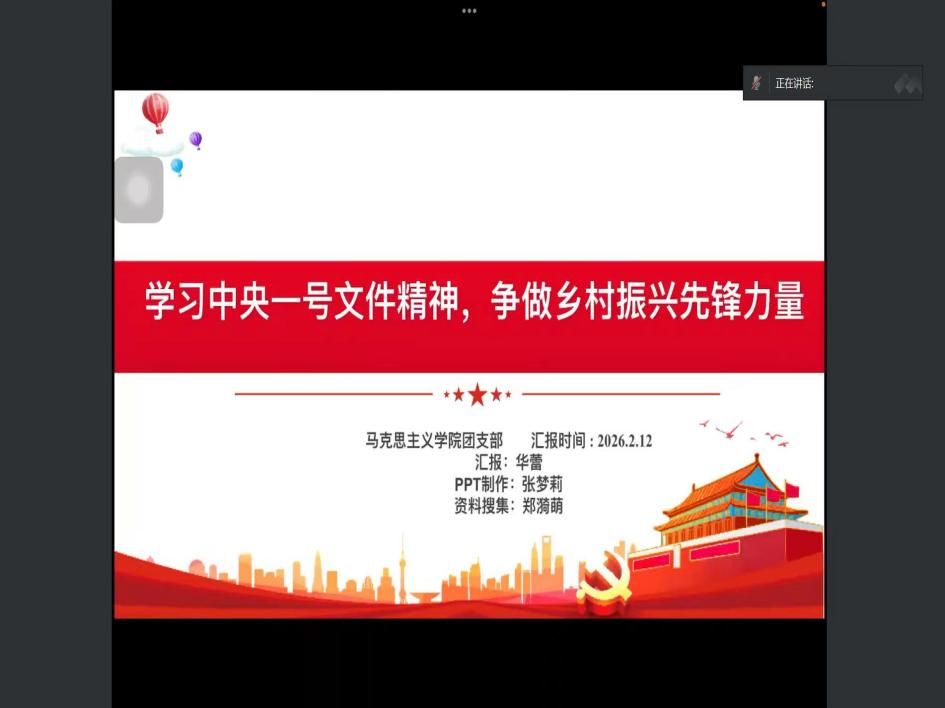 为深入学习贯彻2026年中央一号文件精神,引导青年学生深刻领会新时代农业农村现代化和乡村全面振兴的战略意义,2月12日,成人文学 团支部开展“学习中央一号文件精神,争做乡村振兴先锋力量”主题团课。本次团课由华蕾同学主讲,郑漪萌、张梦莉等同学协作筹备,学院全体团员参加。