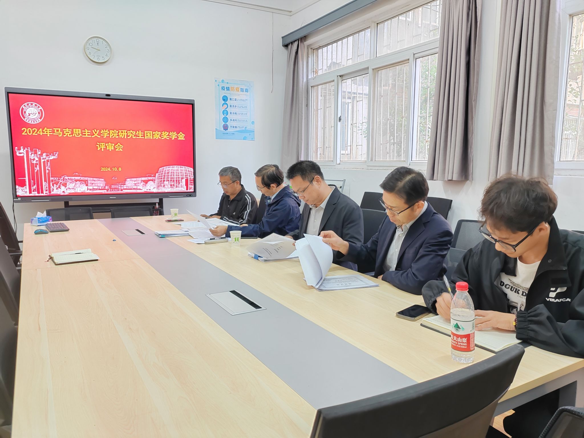 10月8日上午, 成人文学 在南湖校区东配楼115会议室召开国家奖学金评审会。学院院长肖述剑出席评审会,学院教授委员会成员杨豹、商卫星、王海燕,以及2023级研究生谢姚君楠组成的评审小组开展奖学金评定工作。