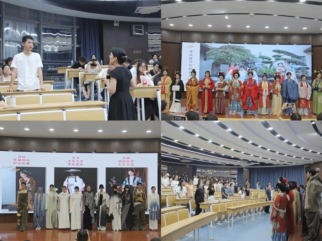 为增强现场体验感,服装学院研究生身着按史料复原的周制深衣、唐制齐胸襦裙、明制马面裙等经典形制服饰,进行立体动态展示。随后,服装表演专业的学生带来一场“传统与现代的对话”主题走秀,借由面料混搭、结构重构,直观演绎传统服饰文化与现代设计理念的碰撞交融。陶辉结合每件服饰的纹样寓意、剪裁工艺,深入阐释了“自信—自省—自新”的文化逻辑:挖掘传统服饰底蕴筑牢自信根基,以开放视野推动多元融合与变革作为自省方向,借创意设计让传统服饰文化在当代焕发生机,实现文化自信。